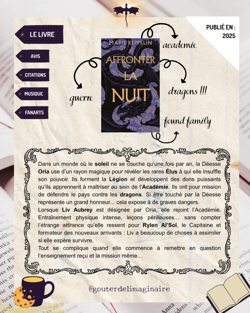 Ce livre te plonge dans son univers où l’on suit Liv Aubrey, choisie par la déesse Oria pour protéger le pays contre… les dragons ! Elle doit donc partir à l’Académie et rejoindre la Légion pour se former. Ce moment déchirant où elle doit quitter sa famille est un peu adouci par la rencontre d’autres Élus qui deviendront ses amis (s’il arrive quelque chose à Ellery…). Mais qui est donc ce Capitaine qui la dévisage intensément dès son arrivée ? 🧐🙈