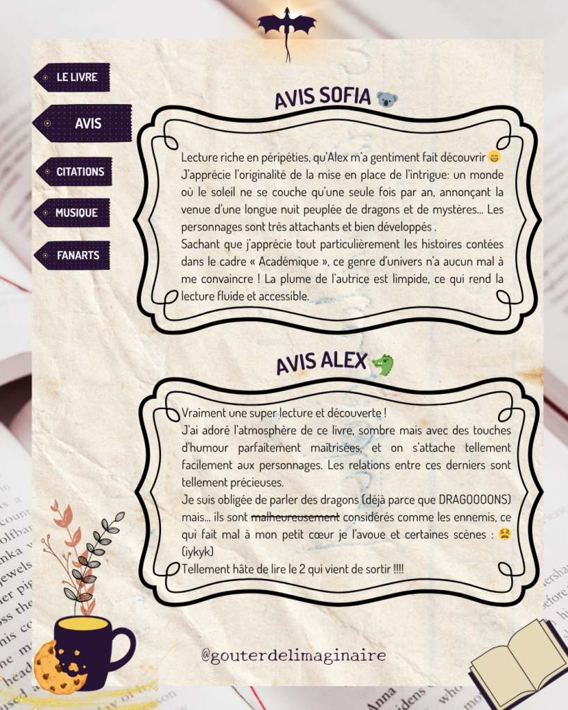 Avis de Sofia 🐨 : Lecture riche en péripéties, qu’Alex m’a gentiment fait découvrir 😁 J’apprécie l’originalité de la mise en place de l’intrigue: un monde où le soleil ne se couche qu’une seule fois par an, annonçant la venue d’une longue nuit peuplée de dragons et de mystères… Les personnages sont très attachants et bien développés . Sachant que j’apprécie tout particulièrement les histoires contées dans le cadre « Académique », ce genre d’univers n’a aucun mal à me convaincre ! La plume de l’autrice est limpide, ce qui rend la lecture fluide et accessible.