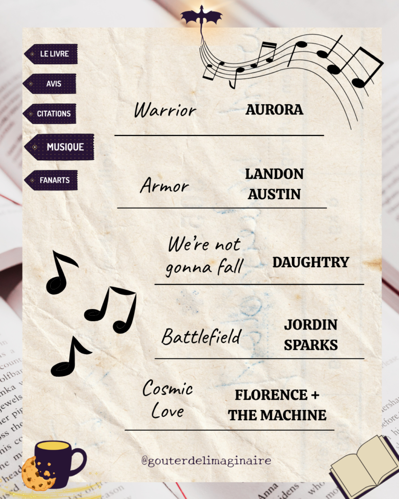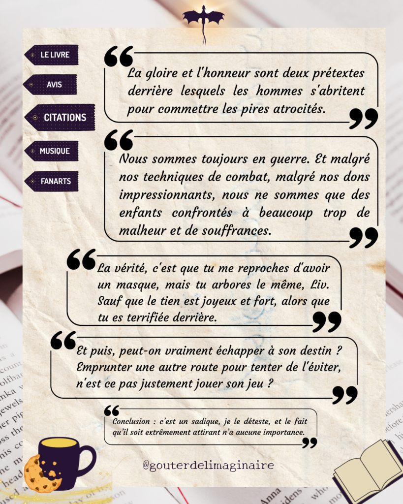 Avis d’Alex 🐉 : Vraiment une super lecture et découverte ! J’ai adoré l’atmosphère de ce livre, sombre mais avec des touches d’humour parfaitement maîtrisées, et on s’attache tellement facilement aux personnages. Les relations entre ces derniers sont tellement précieuses. Je suis obligée de parler des dragons (déjà parce que DRAGOOOONS) mais… ils sont malheureusement considérés comme les ennemis, ce qui fait mal à mon petit cœur je l’avoue et certaines scènes : 😫 (iykyk) Tellement hâte de lire le 2 qui vient de sortir !!!!