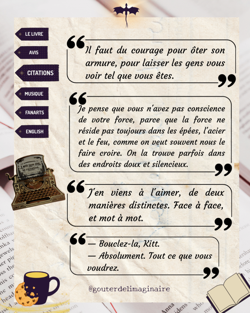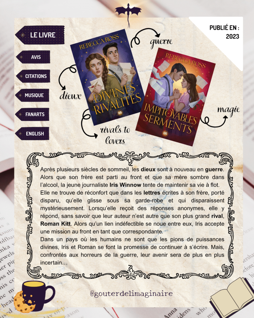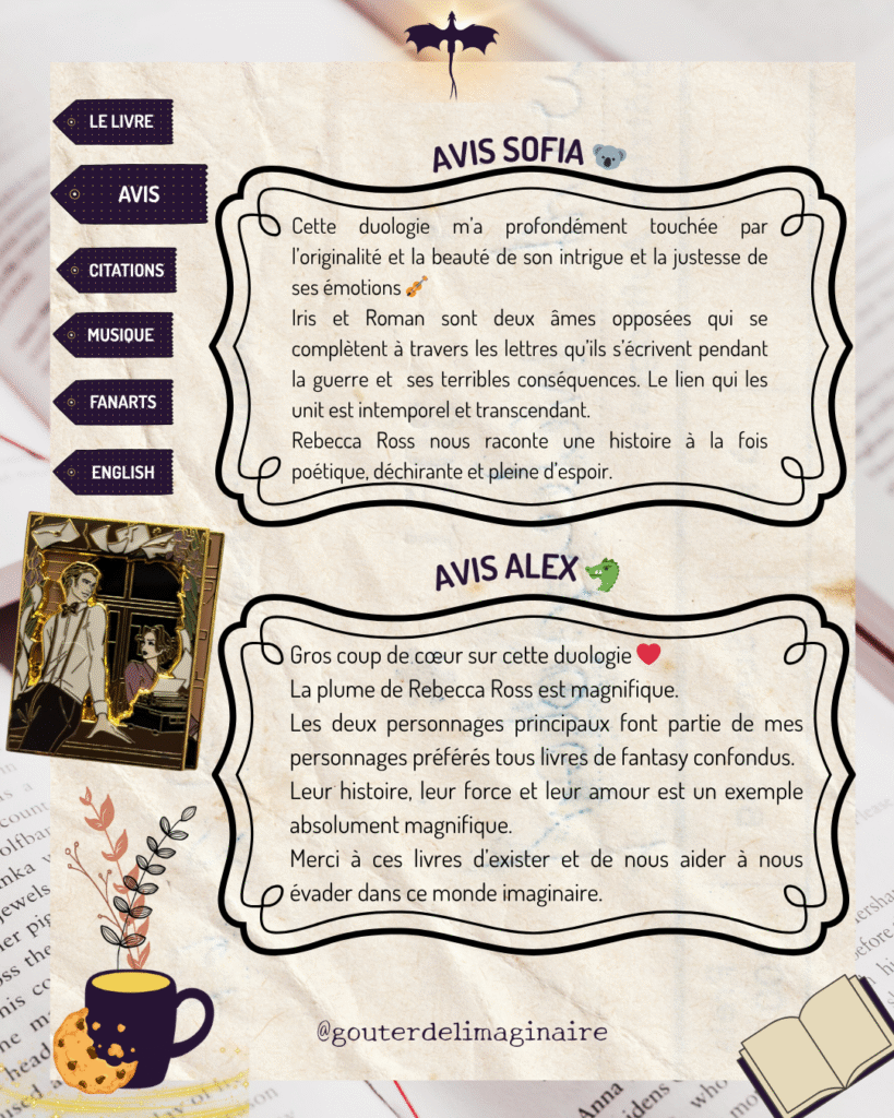Avis d’Alex 🐉 : Gros coup de cœur sur cette duologie ❤️ La plume de Rebecca Ross est magnifique. Les deux personnages principaux font partie de mes personnages préférés tous livres confondus. Leur histoire, leur force et leur amour est un exemple absolument magnifique. Merci à ces livres d’exister et de nous aider à nous évader dans ce monde imaginaire.