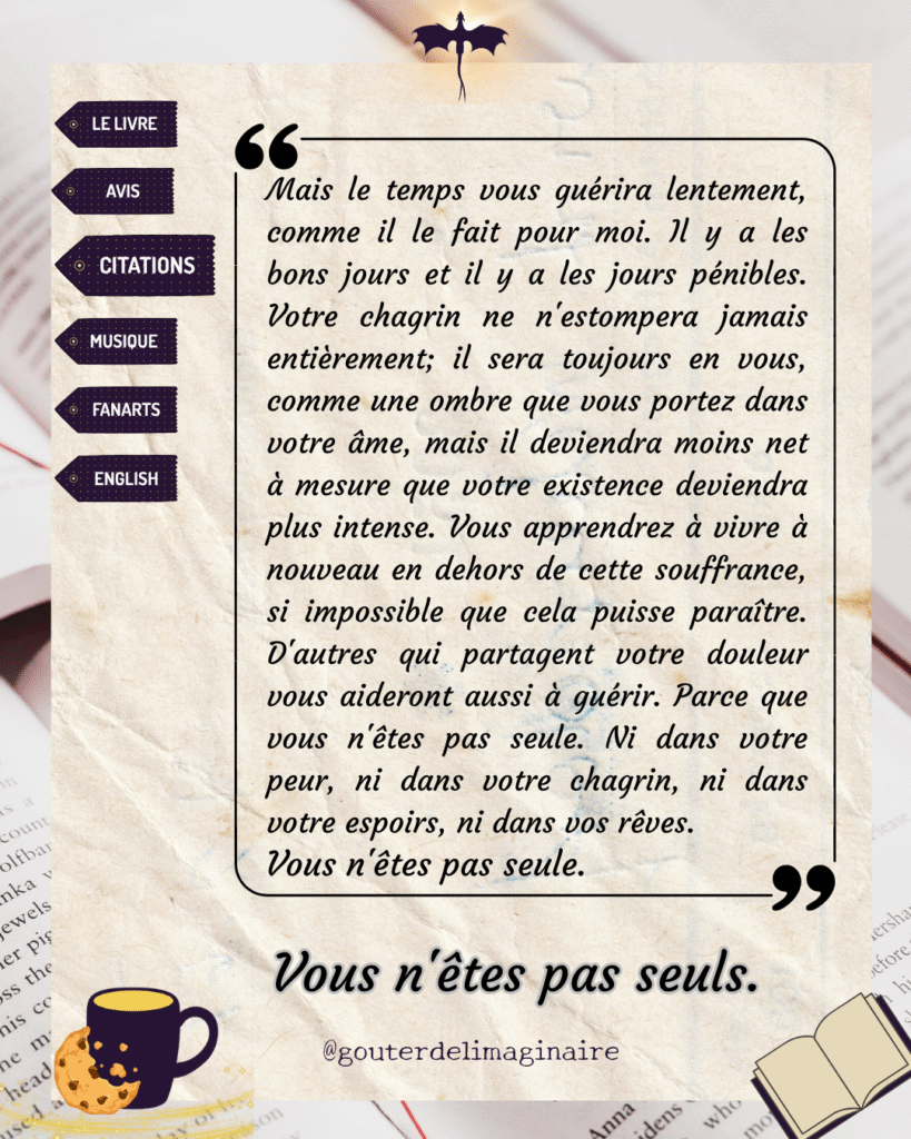 Au-delà de la magnifique romance, ces deux livres parlent avec une telle justesse de la vie et ses difficultés et je ne pourrai jamais assez les remercier de m’avoir aidé moi et ma mère en ces moments difficiles ❤️‍🩹