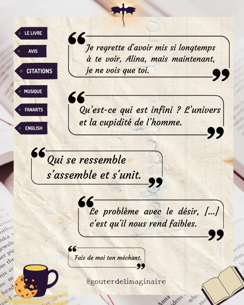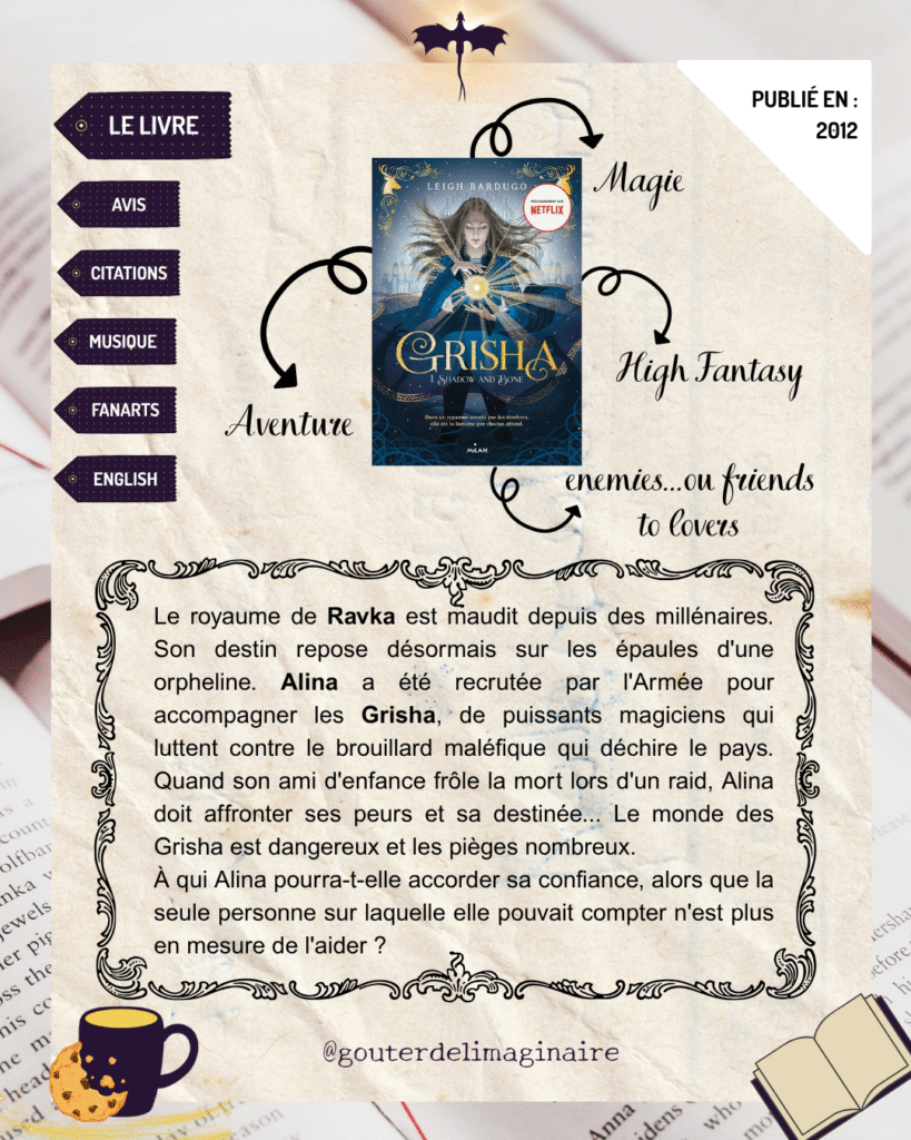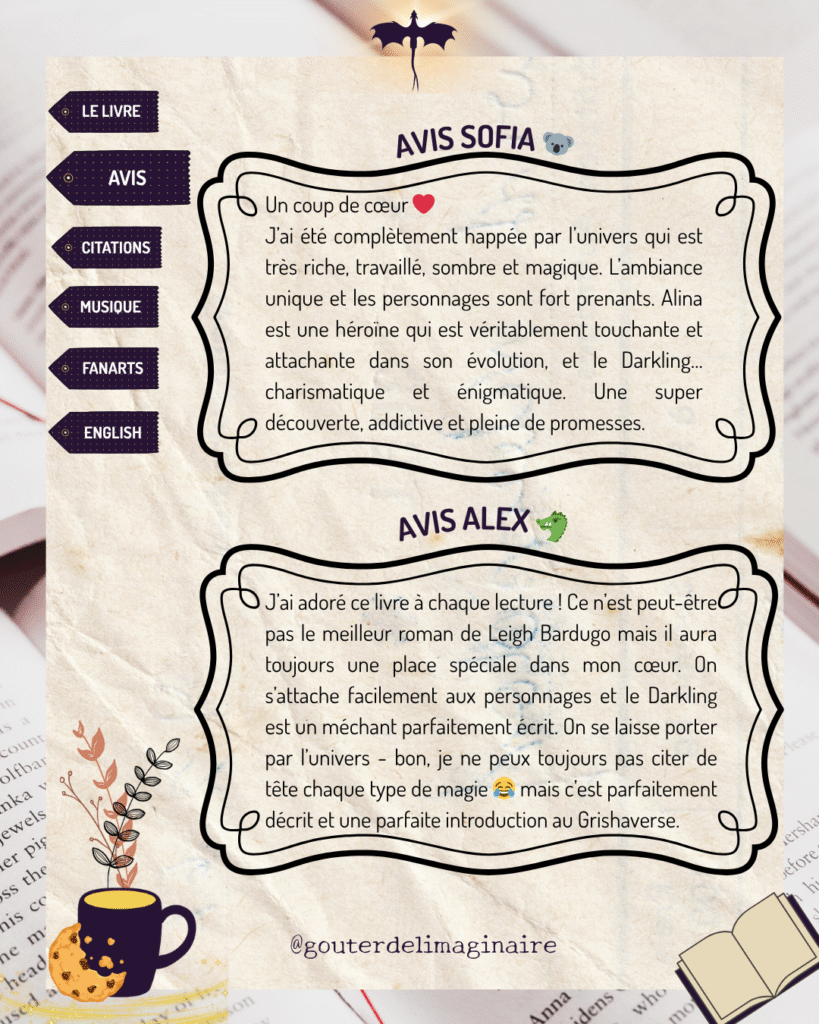 Avis d’Alex 🐉 : J’ai adoré ce livre à chaque lecture ! Ce n’est peut-être pas le meilleur roman de Leigh Bardugo mais il aura toujours une place spéciale dans mon cœur. On s’attache facilement aux personnages et le Darkling est un méchant parfaitement écrit. On se laisse porter par l’univers – bon, je ne peux toujours pas citer de tête chaque type de magie 😂 mais c’est parfaitement décrit et une parfaite introduction au Grishaverse.